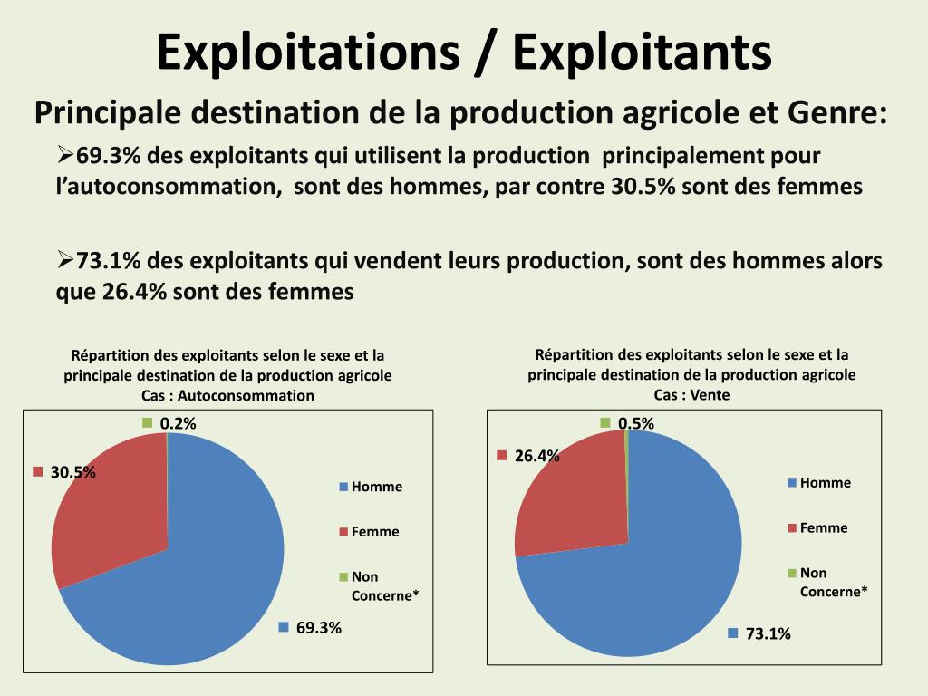 Exploitations / Exploitants Répartition des exploitants selon le sexe et la principale destination de la production agricole Cas : Vente Répartition des exploitants selon le sexe et la principale destination de la production agricole Cas : Autoconsommation Principale destination de la production agricole et Genre: 69.3% des exploitants qui utilisent la production principalement pour l’autoconsommation, sont des hommes, par contre 30.5% sont des femmes 73.1% des exploitants qui vendent leurs production, sont des hommes alors que 26.4% sont des femmes