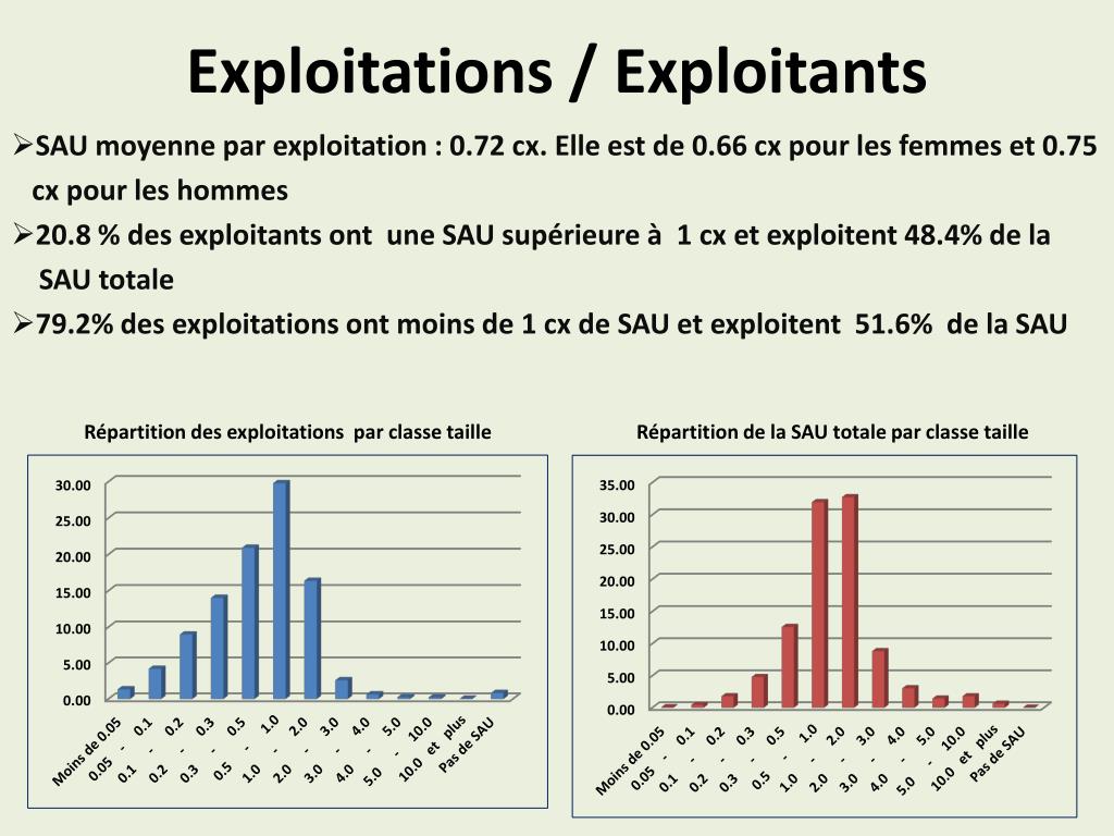 Exploitations / Exploitants SAU moyenne par exploitation : 0.72 cx. Elle est de 0.66 cx pour les femmes et 0.75 cx pour les hommes 20.8 % des exploitants ont une SAU supérieure à 1 cx et exploitent 48.4% de la SAU totale 79.2% des exploitations ont moins de 1 cx de SAU et exploitent 51.6% de la SAU Répartition des exploitations par classe taille Répartition de la SAU totale par classe taille