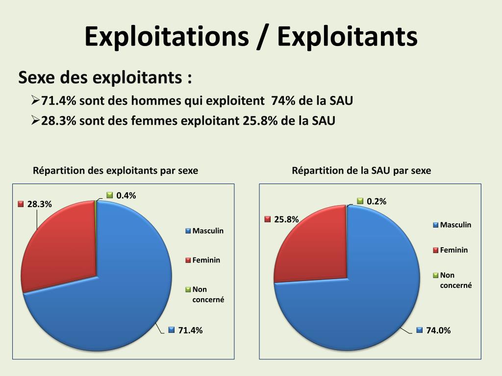 Exploitations / Exploitants Sexe des exploitants : 71.4% sont des hommes qui exploitent 74% de la SAU 28.3% sont des femmes exploitant 25.8% de la SAU Répartition des exploitants par sexe Répartition de la SAU par sexe