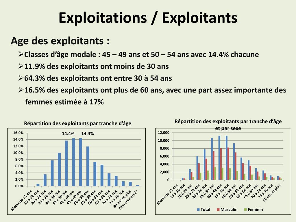 Exploitations / Exploitants Répartition des exploitants par tranche d’âge et par sexe Répartition des exploitants par tranche d’âge Age des exploitants : Classes d’âge modale : 45 – 49 ans et 50 – 54 ans avec 14.4% chacune 11.9% des exploitants ont moins de 30 ans 64.3% des exploitants ont entre 30 à 54 ans 16.5% des exploitants ont plus de 60 ans, avec une part assez importante des femmes estimée à 17%