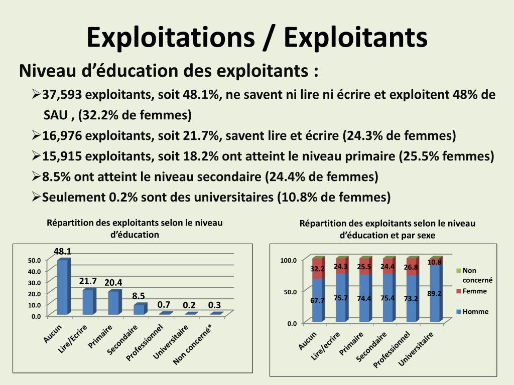 Exploitations / Exploitants Répartition des exploitants selon le niveau d’éducation Répartition des exploitants selon le niveau d’éducation et par sexe Niveau d’éducation des exploitants : 37,593 exploitants, soit 48.1%, ne savent ni lire ni écrire et exploitent 48% de SAU , (32.2% de femmes) 16,976 exploitants, soit 21.7%, savent lire et écrire (24.3% de femmes) 15,915 exploitants, soit 18.2% ont atteint le niveau primaire (25.5% femmes) 8.5% ont atteint le niveau secondaire (24.4% de femmes) Seulement 0.2% sont des universitaires (10.8% de femmes)