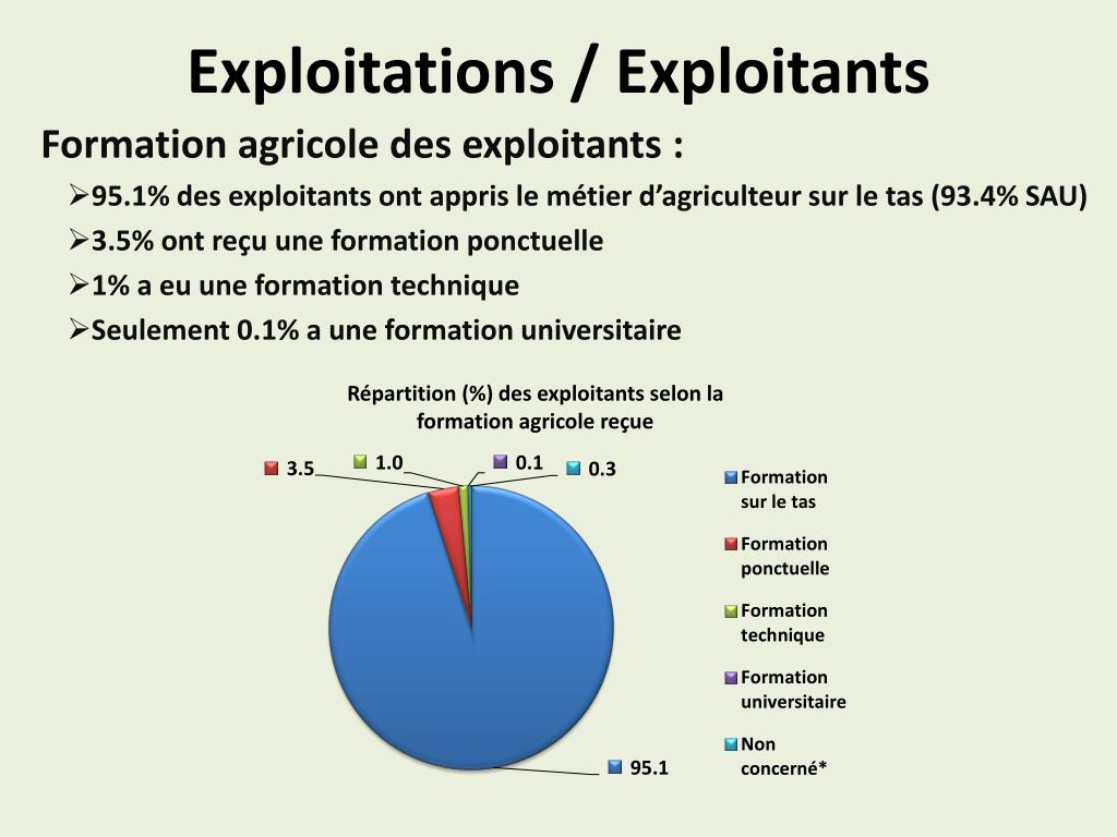 Exploitations / Exploitants Répartition (%) des exploitants selon la formation agricole reçue Formation agricole des exploitants : 95.1% des exploitants ont appris le métier d’agriculteur sur le tas (93.4% SAU) 3.5% ont reçu une formation ponctuelle 1% aeu une formation technique Seulement 0.1% aune formation universitaire
