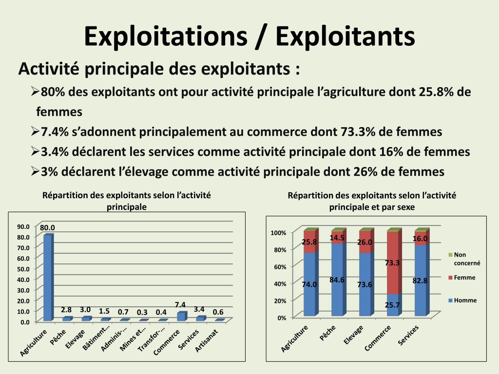 Exploitations / Exploitants Répartition des exploitants selon l’activité principale Répartition des exploitants selon l’activité principale et par sexe Activité principale des exploitants : 80% des exploitants ont pour activité principale l’agriculture dont 25.8% de femmes 7.4% s’adonnent principalement au commerce dont 73.3% de femmes 3.4% déclarent les services comme activité principale dont 16% de femmes 3% déclarent l’élevage comme activité principale dont 26% de femmes