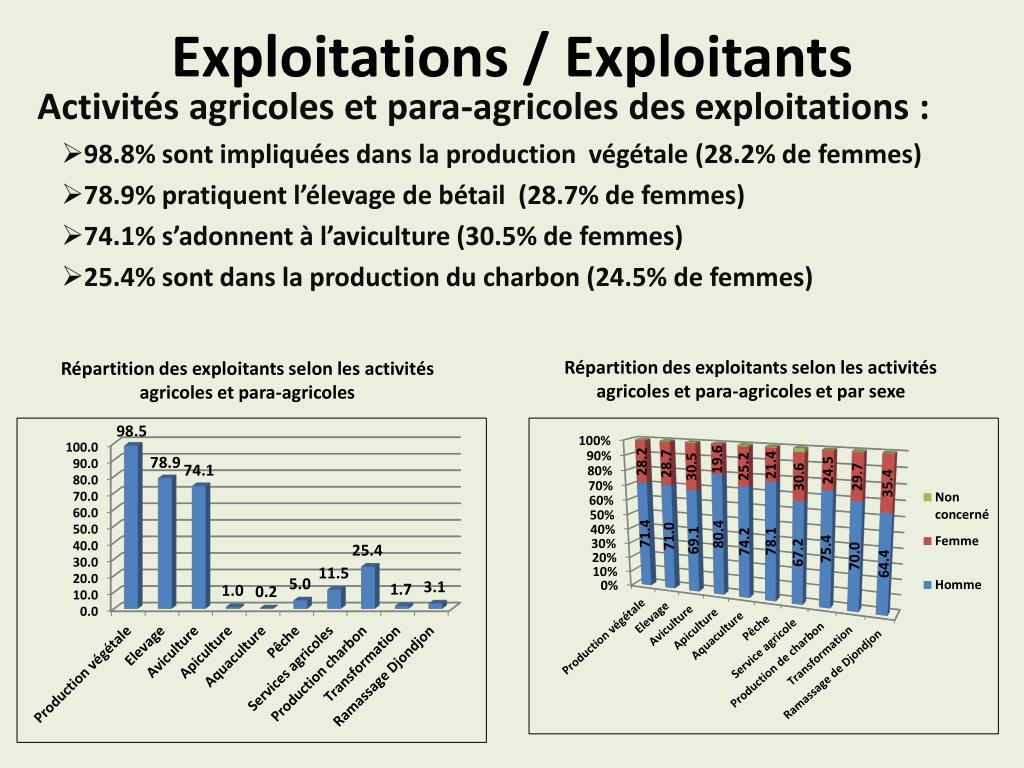 Exploitations / Exploitants Répartition des exploitants selon les activités agricoles et para-agricoles et par sexe Répartition des exploitants selon les activités agricoles et para-agricoles Activités agricoles et para-agricoles des exploitations : 98.8% sont impliquées dans la production végétale (28.2% de femmes) 78.9% pratiquent l’élevage de bétail (28.7% de femmes) 74.1% s’adonnent à l’aviculture (30.5% de femmes) 25.4% sont dans la production du charbon (24.5% de femmes)