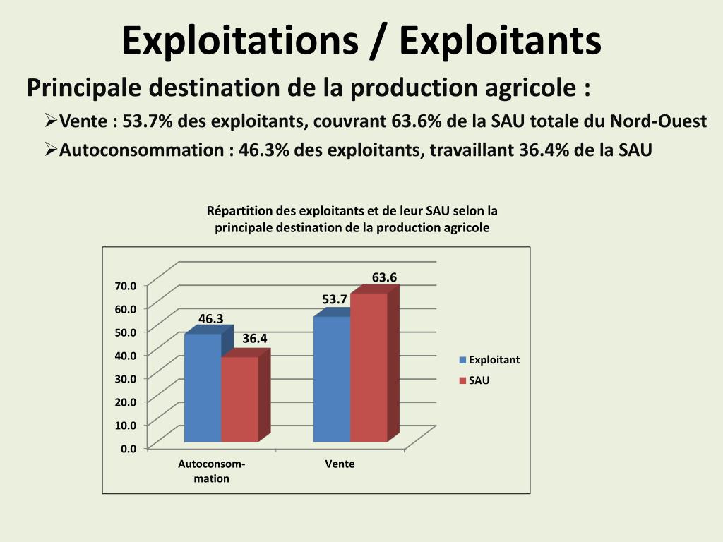 Exploitations / Exploitants Répartition des exploitants et de leur SAU selon la principale destination de la production agricole Principale destination de la production agricole : Vente : 53.7% des exploitants, couvrant 63.6% de la SAU totale du Nord-Ouest Autoconsommation : 46.3% des exploitants, travaillant 36.4% de la SAU