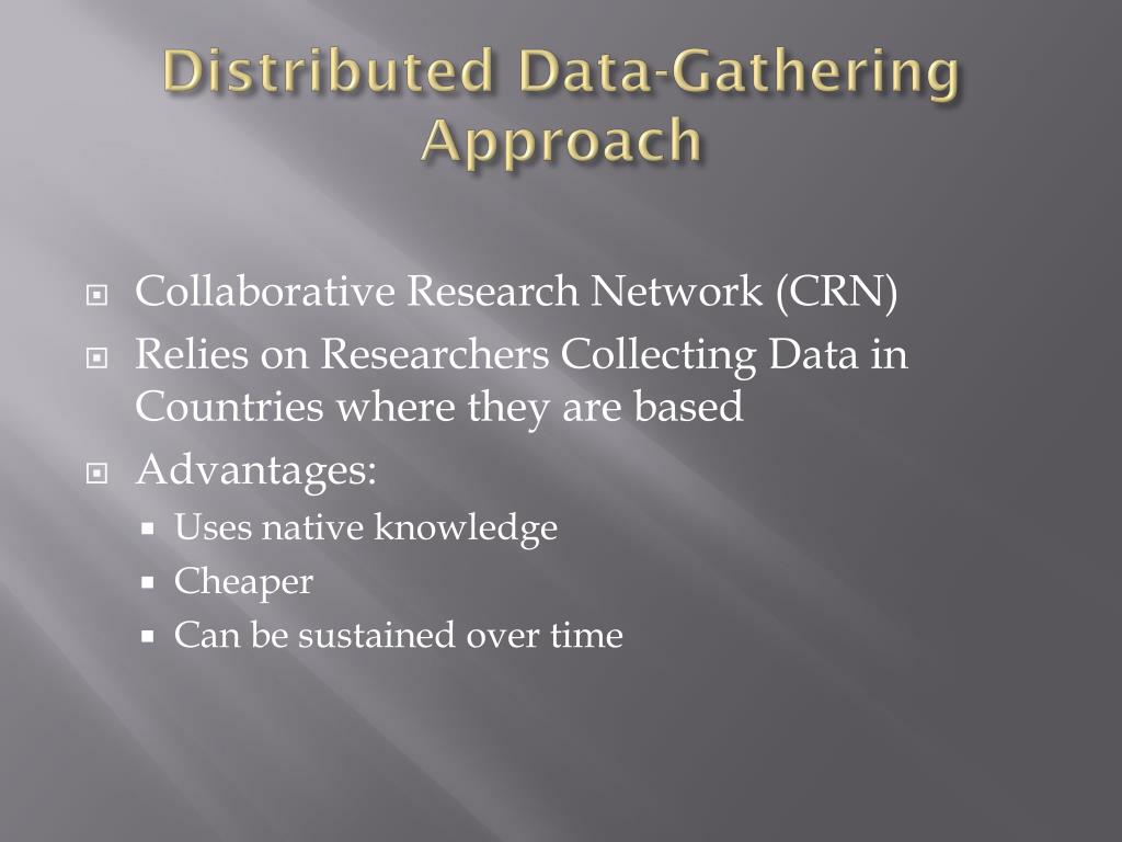 Distributed Data-Gathering Approach • Collaborative Research Network (CRN) • Relies on Researchers Collecting Data in Countries where they are based • Advantages: • Uses native knowledge • Cheaper • Can be sustained over time
