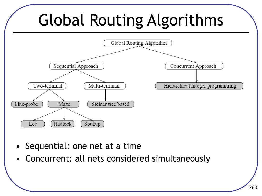 Global Routing Algorithms • Sequential: one net at a time • Concurrent: all nets considered simultaneously