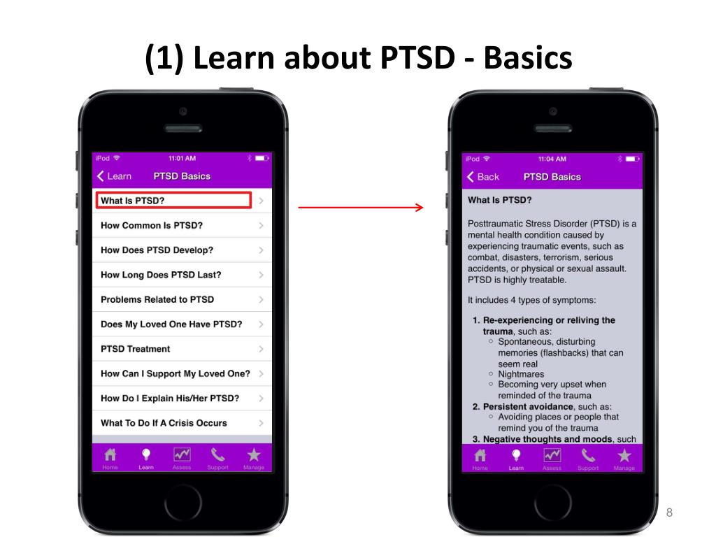 (1) Learn About PTSD Provides user with information derived from PTSD experts about the following topics: • PTSD Basics • Symptomology, treatment, ways to support a loved one with PTSD • Self-Care • Overview of challenges that family members or friends may experience if a loved one has PTSD • Family Care • Impact of PTSD on children & parenting tips • Impact of PTSD on intimate partner relationships, communication tips, & addressing concerns about IPV • Getting Treatment • Communication tips for encouraging treatment, types of treatment providers, counseling options, & overcoming barriers to seeking care
