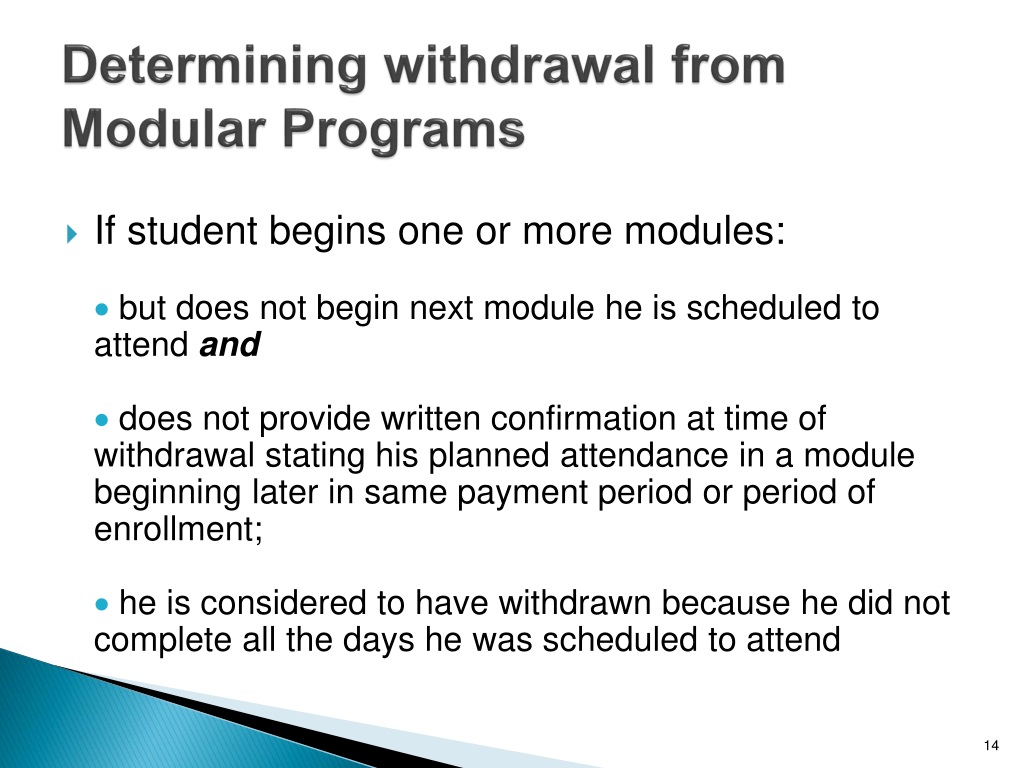 Determining withdrawal from Modular Programs • If student begins one or more modules:but does not begin next module he is scheduled to attend anddoes not provide written confirmation at time of withdrawal stating his planned attendance in a module beginning later in same payment period or period of enrollment;he is considered to have withdrawn because he did not complete all the days he was scheduled to attend