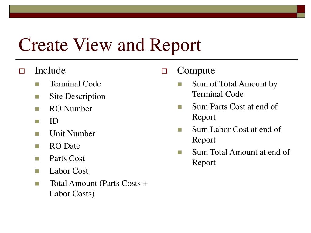 Include Terminal Code Site Description RO Number ID Unit Number RO Date Parts Cost Labor Cost Total Amount (Parts Costs + Labor Costs) Compute Sum of Total Amount by Terminal Code Sum Parts Cost at end of Report Sum Labor Cost at end of Report Sum Total Amount at end of Report Create View and Report