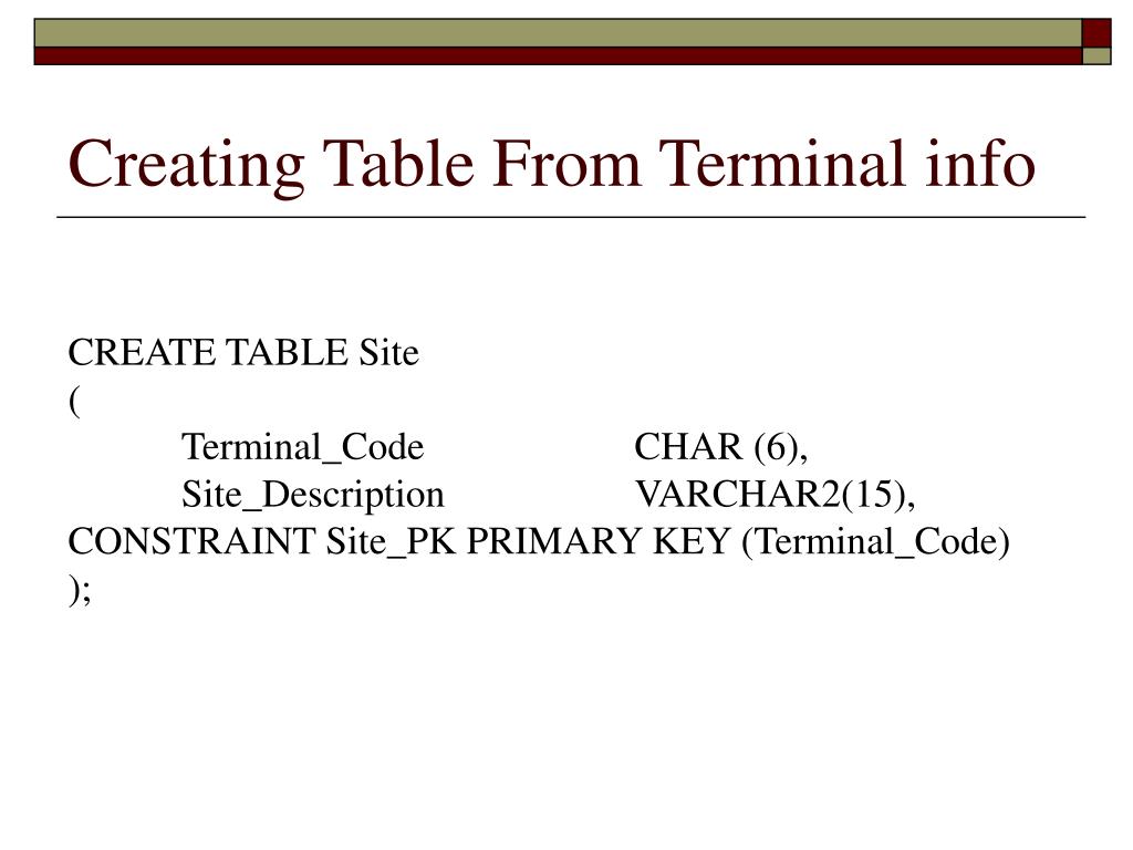 Creating Table From Terminal info CREATE TABLE Site ( Terminal_Code CHAR (6), Site_Description VARCHAR2(15), CONSTRAINT Site_PK PRIMARY KEY (Terminal_Code) );