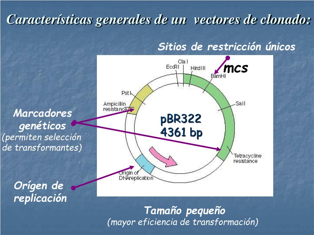Sitios de restricción únicos Marcadores genéticos (permiten selección de transformantes) Orígen de replicación Características generales de un vectores de clonado: mcs pBR322 4361 bp Tamaño pequeño (mayor eficiencia de transformación)