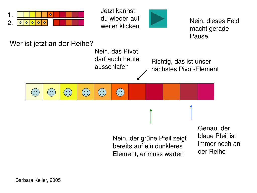 Jetzt kannst du wieder auf weiter klicken 1. Nein, dieses Feld macht gerade Pause 2. Wer ist jetzt an der Reihe? Nein, das Pivot darf auch heute ausschlafen Richtig, das ist unser nächstes Pivot-Element Genau, der blaue Pfeil ist immer noch an der Reihe Nein, der grüne Pfeil zeigt bereits auf ein dunkleres Element, er muss warten