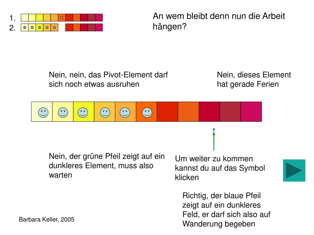 An wem bleibt denn nun die Arbeit hängen? 1. 2. Nein, nein, das Pivot-Element darf sich noch etwas ausruhen Nein, dieses Element hat gerade Ferien Nein, der grüne Pfeil zeigt auf ein dunkleres Element, muss also warten Um weiter zu kommen kannst du auf das Symbol klicken Richtig, der blaue Pfeil zeigt auf ein dunkleres Feld, er darf sich also auf Wanderung begeben