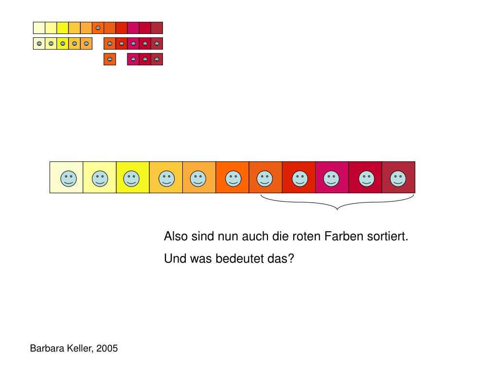 1. 2. Das bedeutet: Wir haben die gelben Farben erfolgreich sortiert. Kannst du dich noch an unsere Aufgabe und den dazugehörenden Plan erinnern? Zuerst die Gelben… Wir wollten diese Farbenreihe sortieren dann die Roten Also machen wir uns jetzt daran, die roten Farben zu sortieren. Drei Mal darfst du raten, wie wir das anstellen werden: Genau! Wieder mit dem gleichen Verfahren wie bisher.