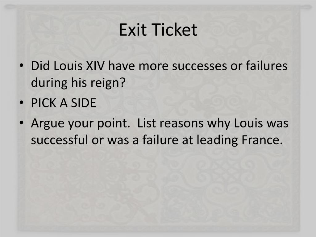Exit Ticket • Did Louis XIV have more successes or failures during his reign? • PICK A SIDE • Argue your point. List reasons why Louis was successful or was a failure at leading France.
