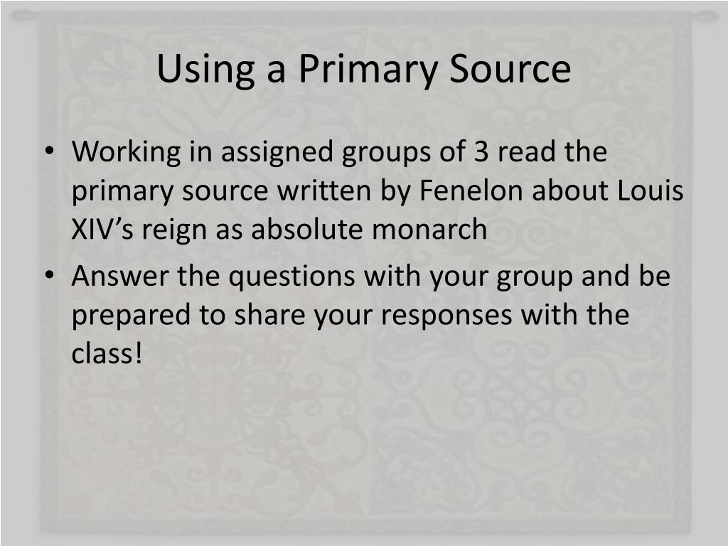 Using a Primary Source • Working in assigned groups of 3 read the primary source written by Fenelon about Louis XIV’s reign as absolute monarch • Answer the questions with your group and be prepared to share your responses with the class!