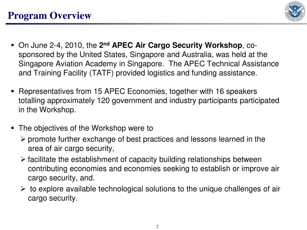 Program Overview • On June 2-4, 2010, the 2nd APEC Air Cargo Security Workshop, co-sponsored by the United States, Singapore and Australia, was held at the Singapore Aviation Academy in Singapore. The APEC Technical Assistance and Training Facility (TATF) provided logistics and funding assistance. • Representatives from 15 APEC Economies, together with 16 speakers totalling approximately 120 government and industry participants participated in the Workshop. • The objectives of the Workshop were to • promote further exchange of best practices and lessons learned in the area of air cargo security, • facilitate the establishment of capacity building relationships between contributing economies and economies seeking to establish or improve air cargo security, and. • to explore available technological solutions to the unique challenges of air cargo security.