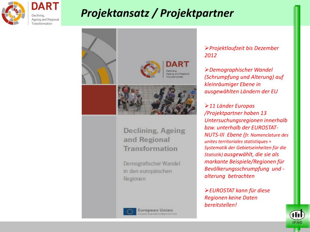 Projektansatz/Projektpartner • IFAD-Indikatoren-Komplexe: • Demographie • Arbeitsmarkt • Bildung • Gesundheit • Ergebnisformen v. a.: • Regionale Datenbänke, • Regionenporträts, • DART-Beobachtungsmonitor, • Regionenvergleich Abgleich der Indikatoren und Standards mit „best practice“ Projekten in den einzelnen Untersuchungsregionen