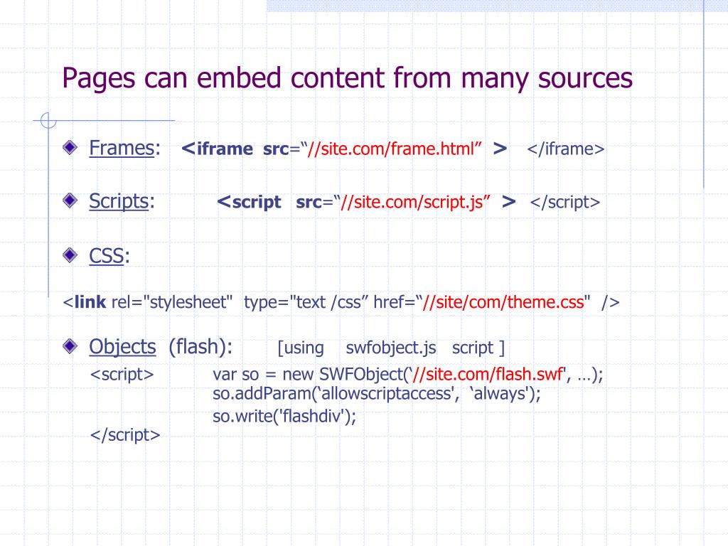 Pages can embed content from many sources • Frames: <iframesrc=“//site.com/frame.html” > </iframe> • Scripts: <script src=“//site.com/script.js” > </script> • CSS: <linkrel="stylesheet" type="text /css” href=“//site/com/theme.css" /> • Objects (flash): [using swfobject.js script ] <script> var so = new SWFObject(‘//site.com/flash.swf', …); so.addParam(‘allowscriptaccess', ‘always'); so.write('flashdiv'); </script>