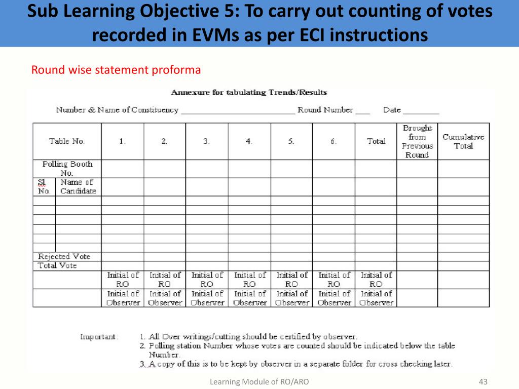 Sub Learning Objective 5: To carry out counting of votes recorded in EVMs as per ECI instructions Annexure XLII of RO HB - Sample Final Result Sheet duly completed Learning Module of RO/ARO 43