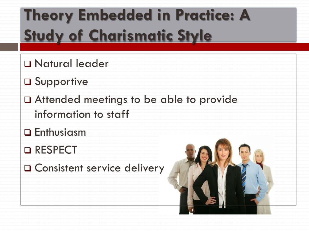 Theory Embedded in Practice: A Study of Charismatic Style • Natural leader • Supportive • Attended meetings to be able to provide information to staff • Enthusiasm • RESPECT • Consistent service delivery