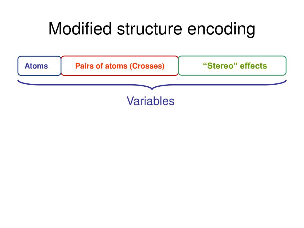 Modified structure encoding “Stereo” effects Atoms Pairs of atoms (Crosses) Variables