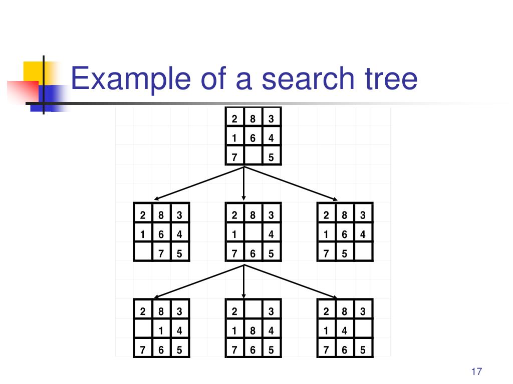 Search trees • A graph representing the search process • Implicit graphs and explicit graphs • Branching factor and depth • Generating and expanding states • Open and closed lists of nodes • Representing a node of the explicit graph: class Node: State = None ParentNode = None Operator = None Depth = None PathCost = None