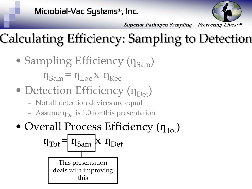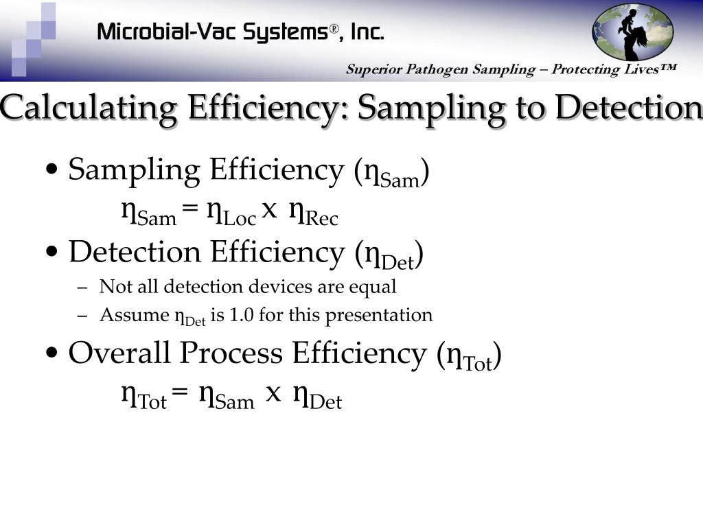 Sampling Efficiency (ƞSam) ƞSam = ƞLoc xƞRec Detection Efficiency (ƞDet) Not all detection devices are equal Assume ƞDet is 1.0 for this presentation Overall Process Efficiency (ƞTot) ƞTot =ƞSam xƞDet Calculating Efficiency: Sampling to Detection