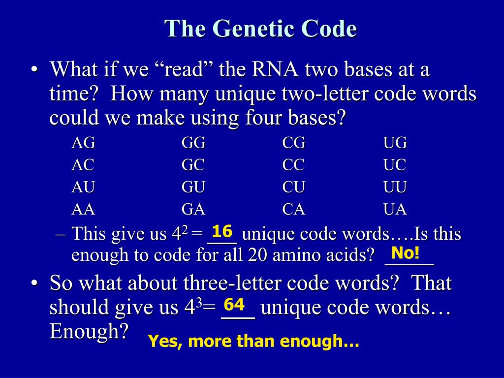 The Genetic Code • What if we “read” the RNA two bases at a time? How many unique two-letter code words could we make using four bases? AG GG CG UG AC GC CC UC AU GU CU UU AA GA CA UA • This give us 42 = ___ unique code words….Is this enough to code for all 20 amino acids? _____ • So what about three-letter code words? That should give us 43= ___ unique code words… Enough? 16 No! 64 Yes, more than enough…