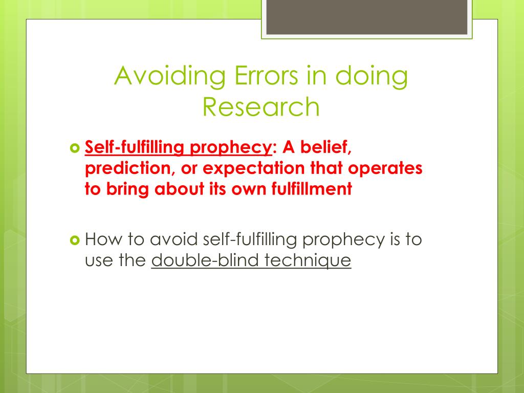 Avoiding Errors in doing Research • Self-fulfilling prophecy: A belief, prediction, or expectation that operates to bring about its own fulfillment • How to avoid self-fulfilling prophecy is to use the double-blind technique