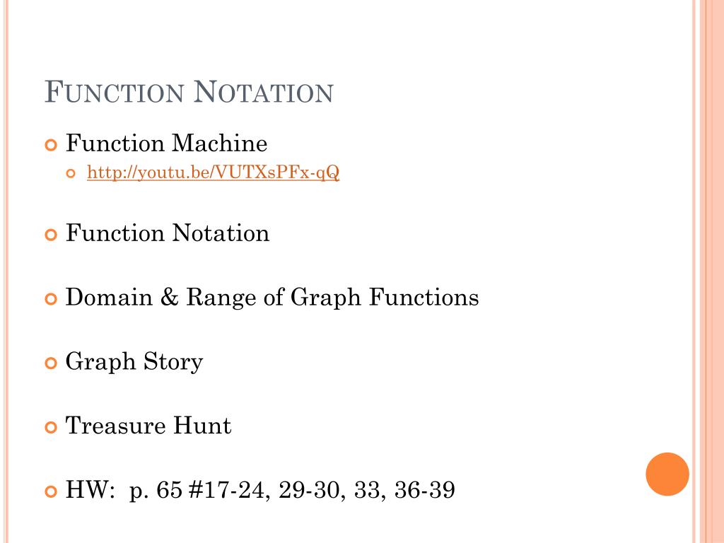 Function Notation • Function Machine • http://youtu.be/VUTXsPFx-qQ • Function Notation • Domain & Range of Graph Functions • Graph Story • Treasure Hunt • HW: p. 65 #17-24, 29-30, 33, 36-39