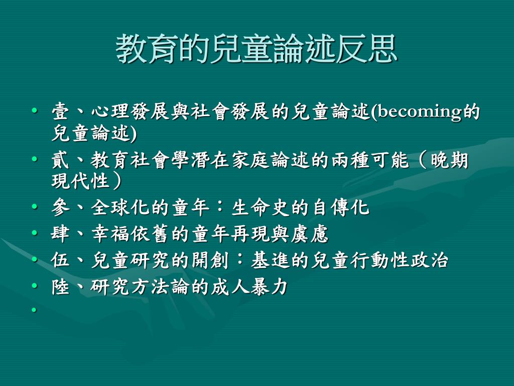 教育的兒童論述反思 • 壹、心理發展與社會發展的兒童論述(becoming的兒童論述) • 貳、教育社會學潛在家庭論述的兩種可能(晚期現代性) • 參、全球化的童年:生命史的自傳化 • 肆、幸福依舊的童年再現與虞慮 • 伍、兒童研究的開創:基進的兒童行動性政治 • 陸、研究方法論的成人暴力