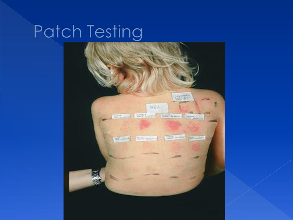 Patch Testing Allergens within occlusive patches are applied to normal skin for 48 hours If the client is allergic, erythematous skin reaction will occur Pt should discontinue any antihistamines 2 days before the test