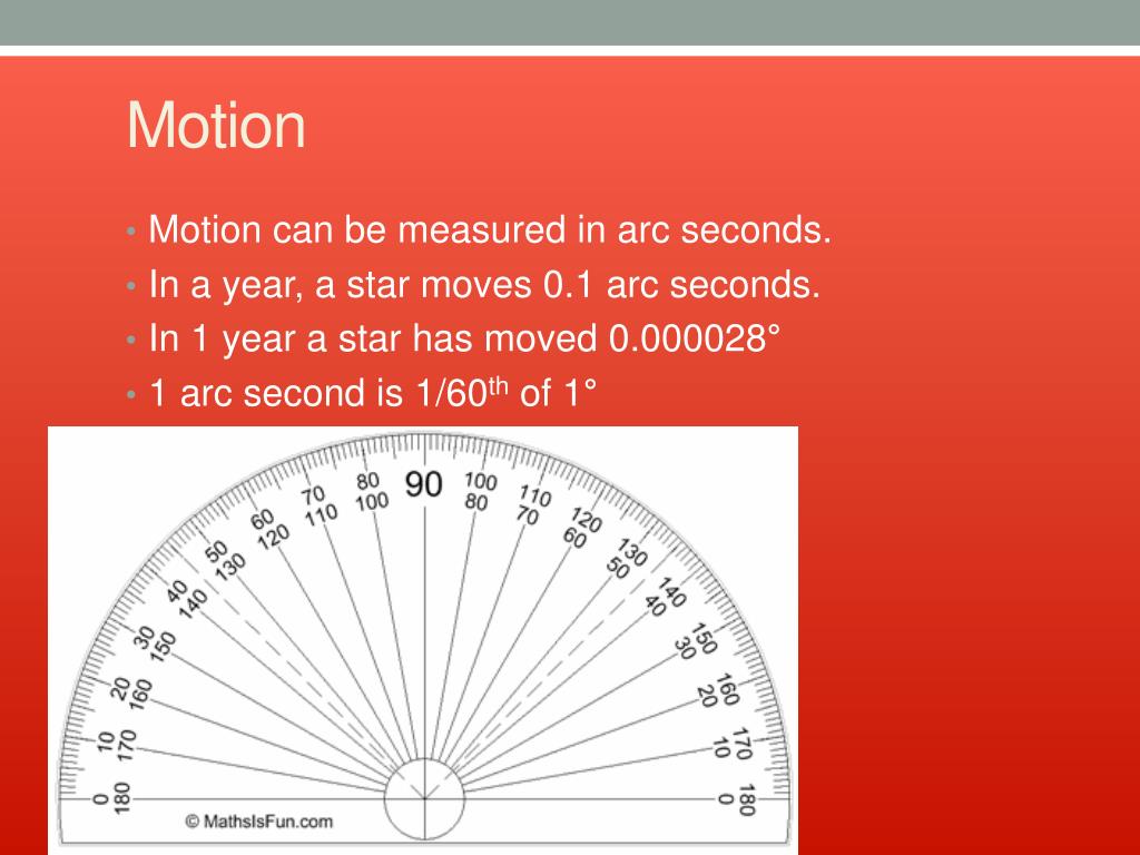 Motion • Motion can be measured in arc seconds. • In a year, a star moves 0.1 arc seconds. • In 1 year a star has moved 0.000028° • 1 arc second is 1/60th of 1°