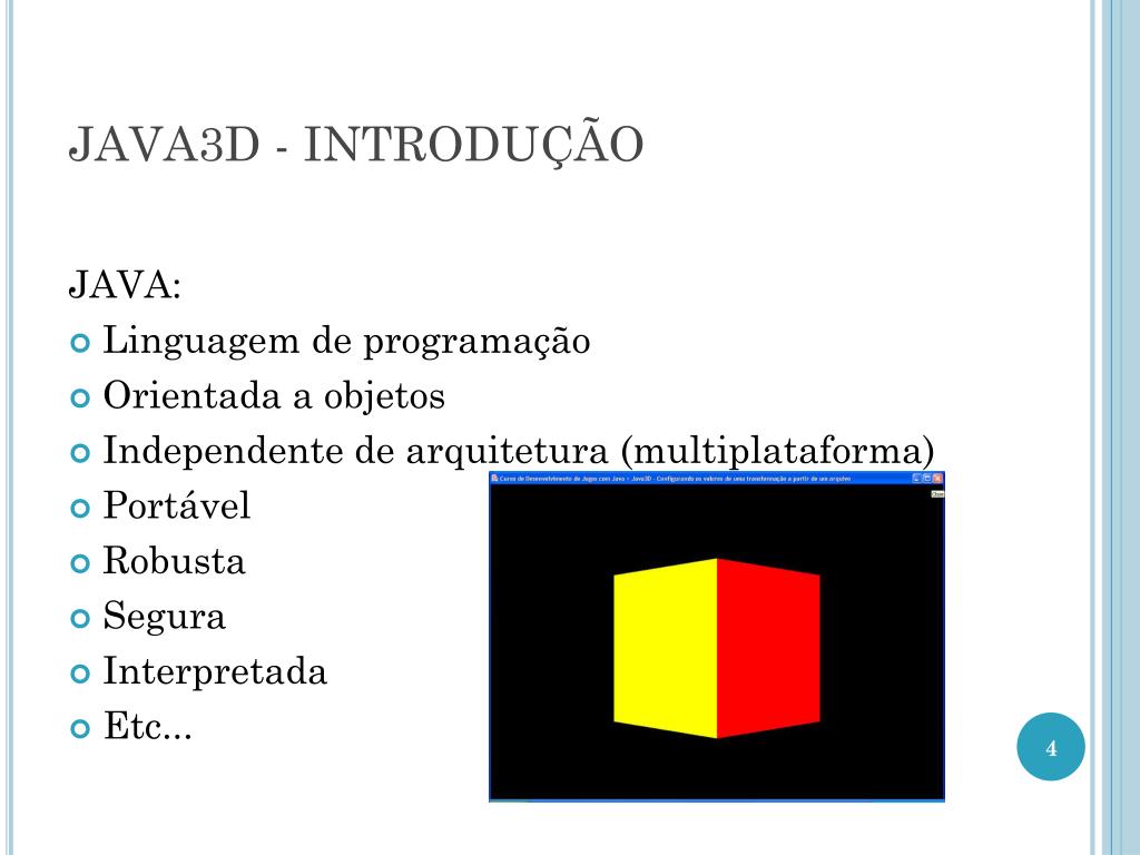 JAVA3D - INTRODUÇÃO JAVA: • Linguagem de programação • Orientada a objetos • Independente de arquitetura (multiplataforma) • Portável • Robusta • Segura • Interpretada • Etc...