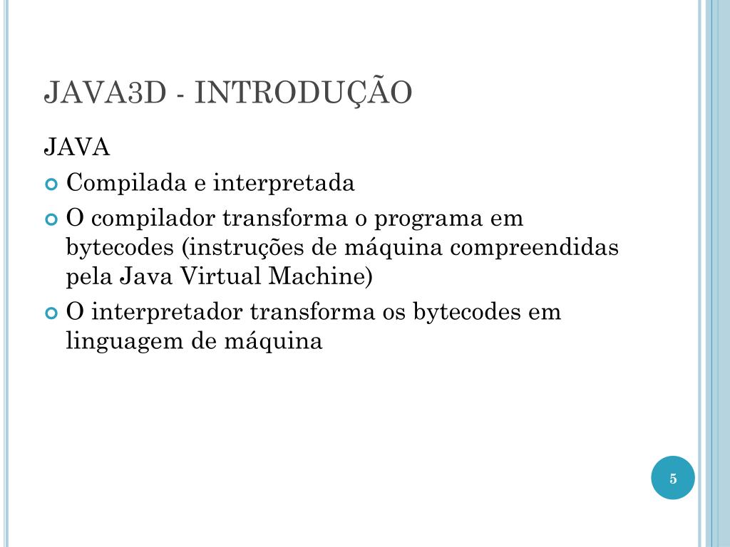 JAVA3D - INTRODUÇÃO JAVA • Compilada e interpretada • O compilador transforma o programa em bytecodes (instruções de máquina compreendidas pela Java Virtual Machine) • O interpretador transforma os bytecodes em linguagem de máquina