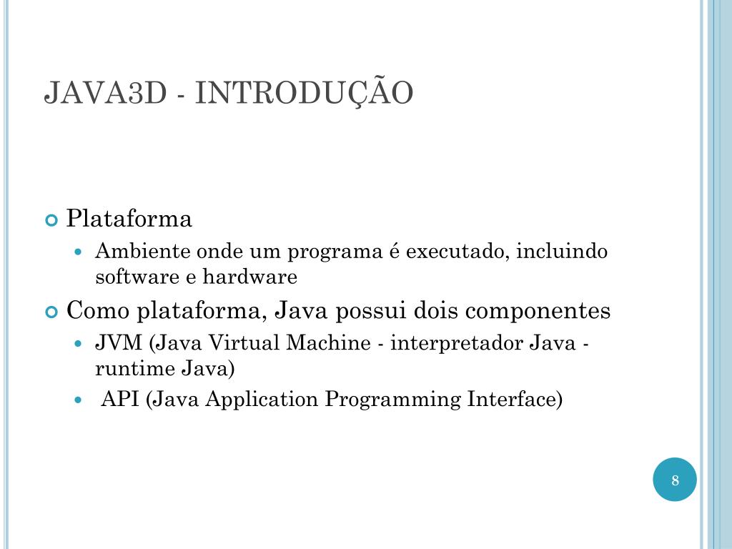 JAVA3D - INTRODUÇÃO • Plataforma • Ambienteonde um programa é executado, incluindo software e hardware • Como plataforma, Java possuidoiscomponentes • JVM (Java Virtual Machine - interpretador Java - runtime Java) • API (Java Application Programming Interface)