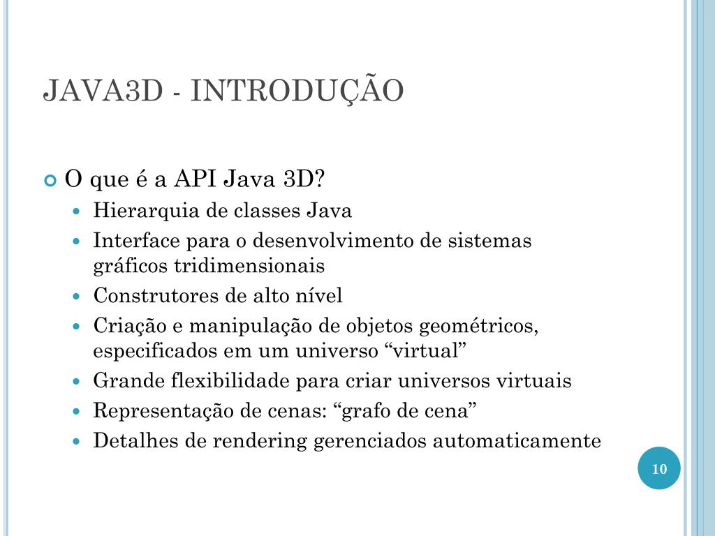 JAVA3D - INTRODUÇÃO • Java Media Framework API • Suporta tecnologias gráficas e multimídia • Áudio • Vídeo • 2D • Animação • 3D • Um dos componentes da API Java Standard Extension é Java 3D