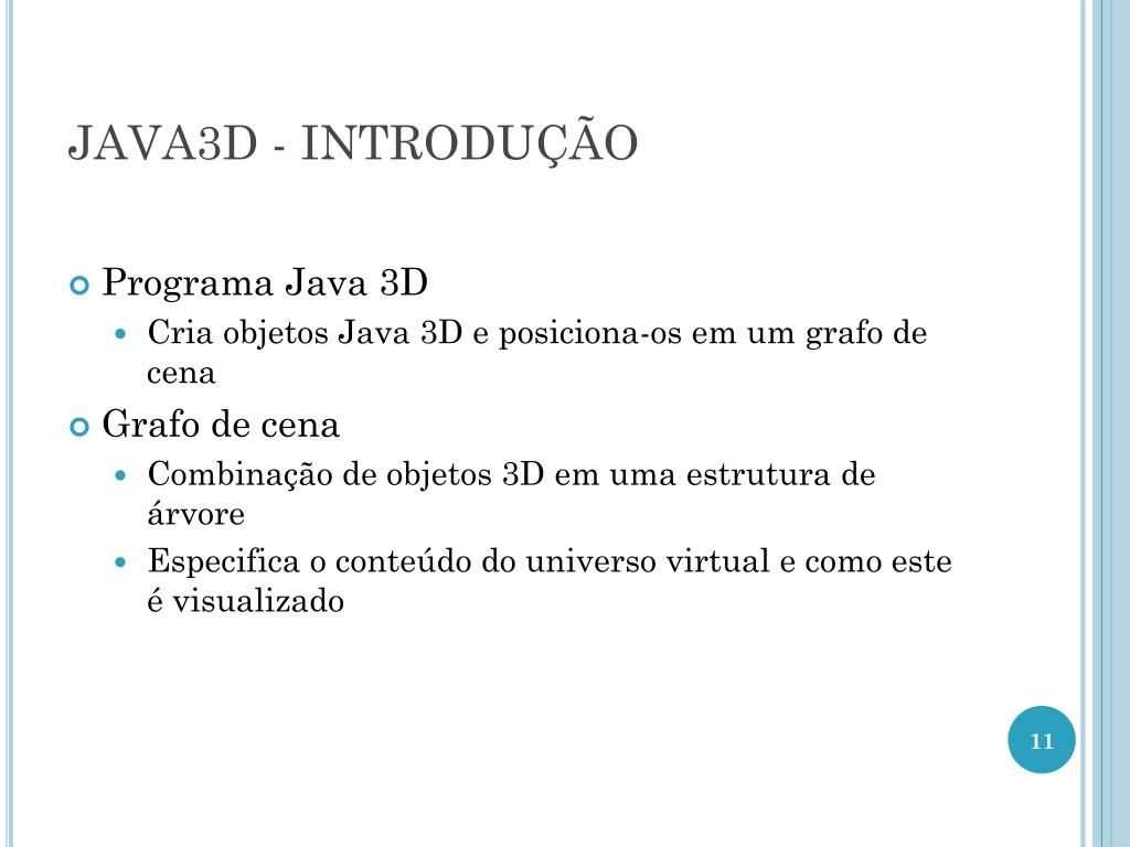 JAVA3D - INTRODUÇÃO • Programa Java 3D • Cria objetos Java 3D e posiciona-os em um grafo de cena • Grafo de cena • Combinação de objetos 3D em uma estrutura de árvore • Especifica o conteúdo do universo virtual e como este é visualizado
