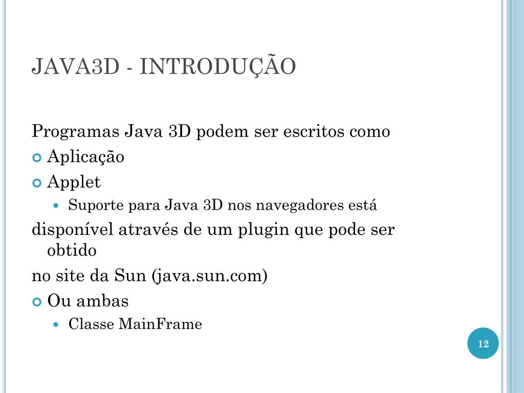 JAVA3D - INTRODUÇÃO Programas Java 3D podem ser escritos como • Aplicação • Applet • Suporte para Java 3D nos navegadores está disponível através de um plugin que pode ser obtido no site da Sun (java.sun.com) • Ou ambas • Classe MainFrame