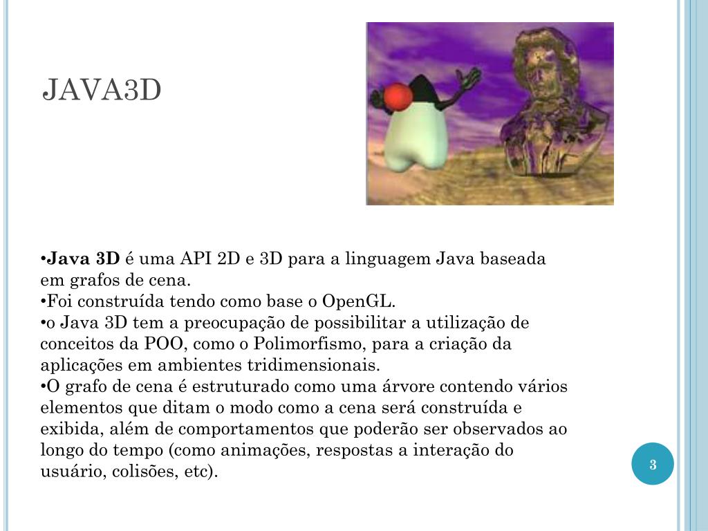 JAVA3D • Java 3D é uma API 2D e 3D para a linguagem Java baseada em grafos de cena. • Foi construída tendo como base o OpenGL. • o Java 3D tem a preocupação de possibilitar a utilização de conceitos da POO, como o Polimorfismo, para a criação da aplicações em ambientes tridimensionais. • O grafo de cena é estruturado como uma árvore contendo vários elementos que ditam o modo como a cena será construída e exibida, além de comportamentos que poderão ser observados ao longo do tempo (como animações, respostas a interação do usuário, colisões, etc).