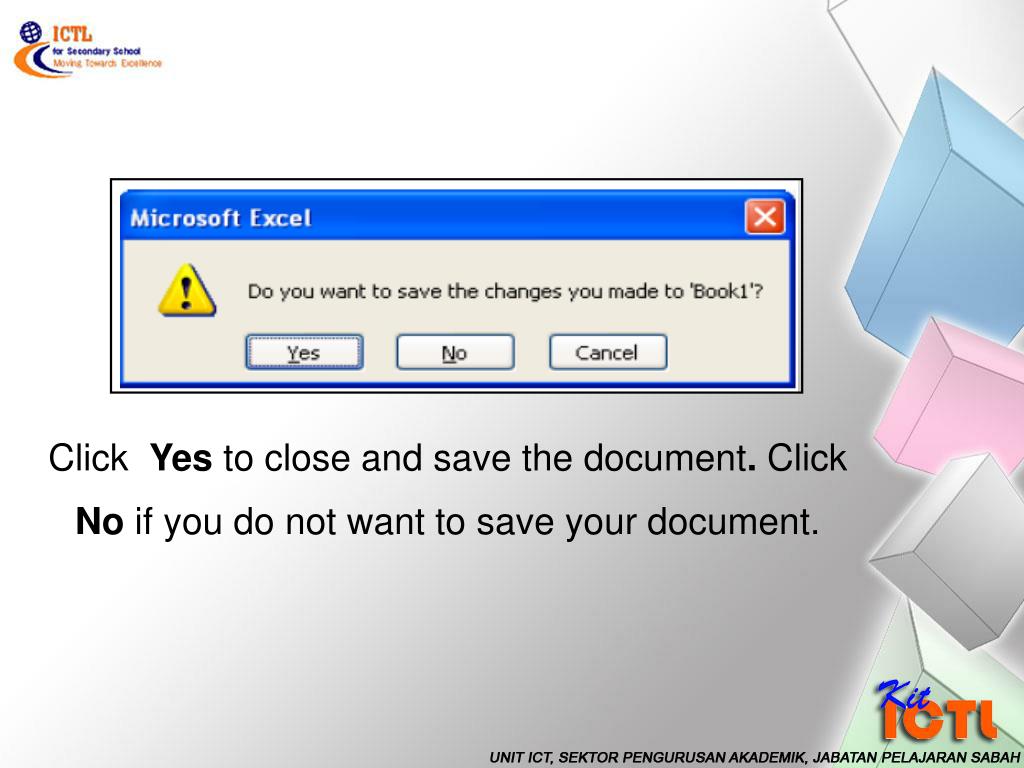 Activity 6: Close A Workbook • After the document saved, you can follow the next step to close it from your computer screen. • Click File on the menu toolbar. • Click Close to close the current workbook. • The following dialog box will be displayed if the workbook is not save