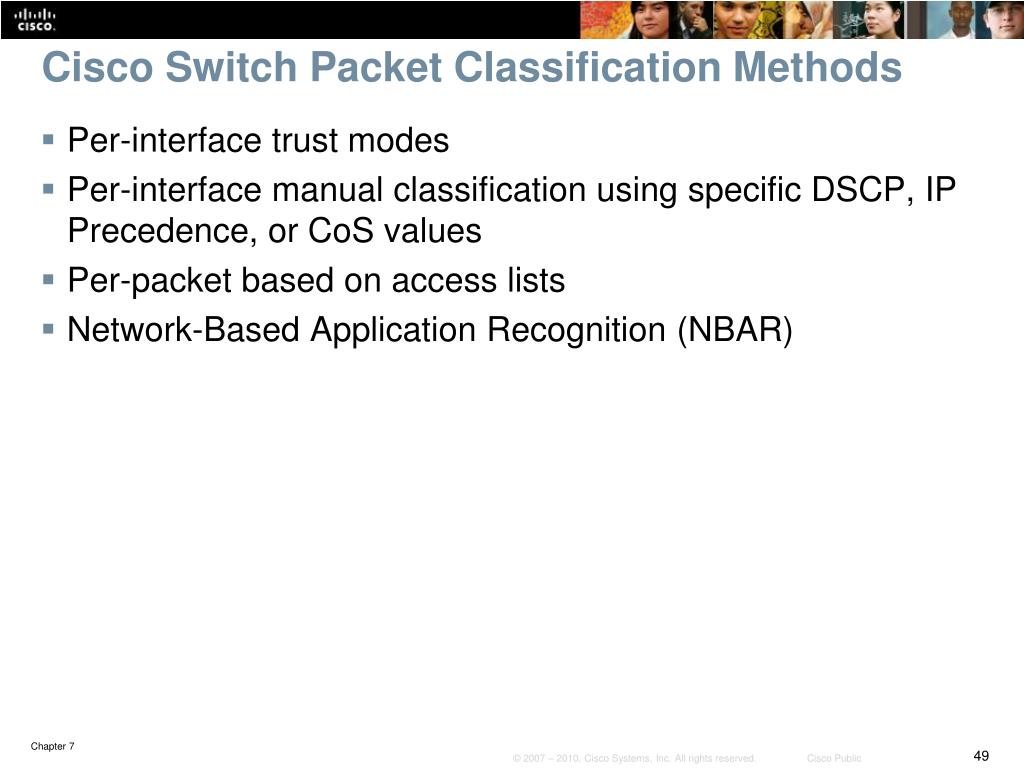 Cisco Switch Packet Classification Methods • Per-interface trust modes • Per-interface manual classification using specific DSCP, IP Precedence, or CoS values • Per-packet based on access lists • Network-Based Application Recognition (NBAR)