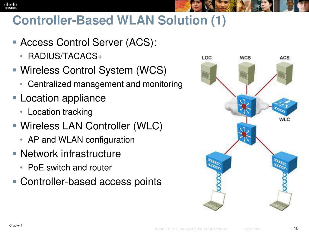 Controller-Based WLAN Solution (1) • Access Control Server (ACS): • RADIUS/TACACS+ • Wireless Control System (WCS) • Centralized management and monitoring • Location appliance • Location tracking • Wireless LAN Controller (WLC) • AP and WLAN configuration • Network infrastructure • PoE switch and router • Controller-based access points