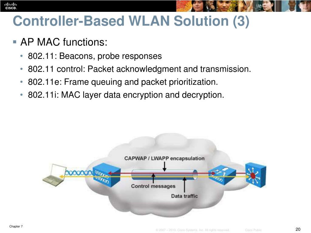 Controller-Based WLAN Solution (3) • AP MAC functions: • 802.11: Beacons, probe responses • 802.11 control: Packet acknowledgment and transmission. • 802.11e: Frame queuing and packet prioritization. • 802.11i: MAC layer data encryption and decryption.