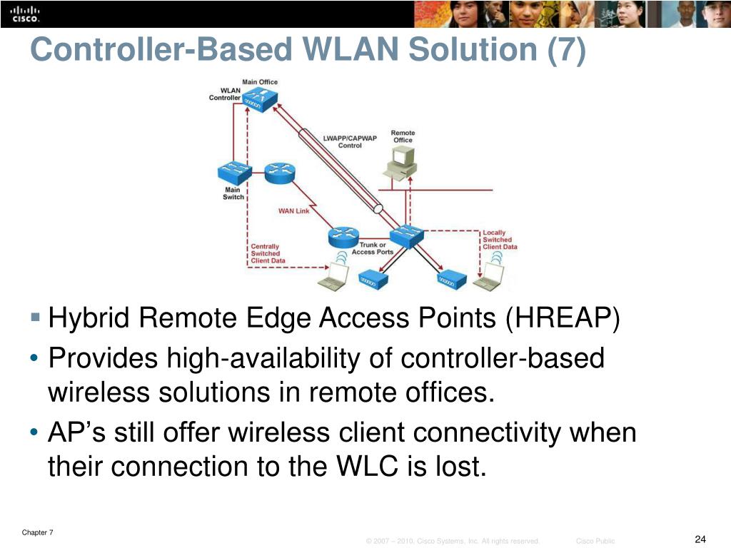 Controller-Based WLAN Solution (7) • Hybrid Remote Edge Access Points (HREAP) • Provides high-availability of controller-based wireless solutions in remote offices. • AP’s still offer wireless client connectivity when their connection to the WLC is lost.