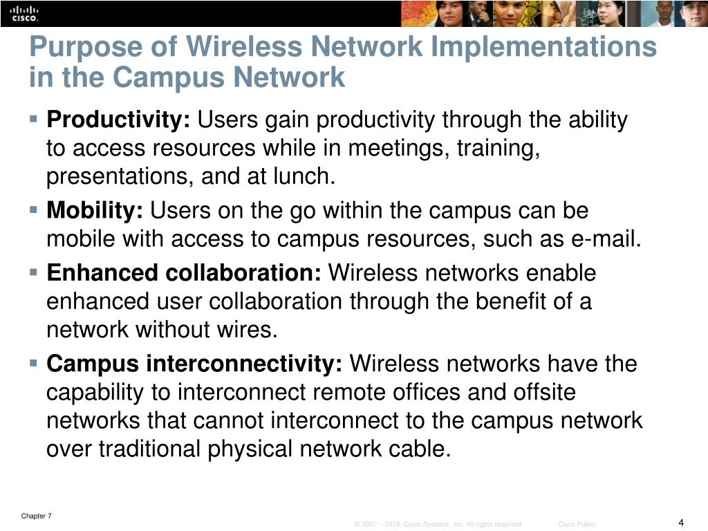 Purpose of Wireless Network Implementations in the Campus Network • Productivity: Users gain productivity through the ability to access resources while in meetings, training, presentations, and at lunch. • Mobility: Users on the go within the campus can be mobile with access to campus resources, such as e-mail. • Enhanced collaboration: Wireless networks enable enhanced user collaborationthrough the benefit of a network without wires. • Campus interconnectivity: Wireless networks have the capability to interconnect remote offices and offsite networks that cannot interconnect to the campus network over traditional physical network cable.