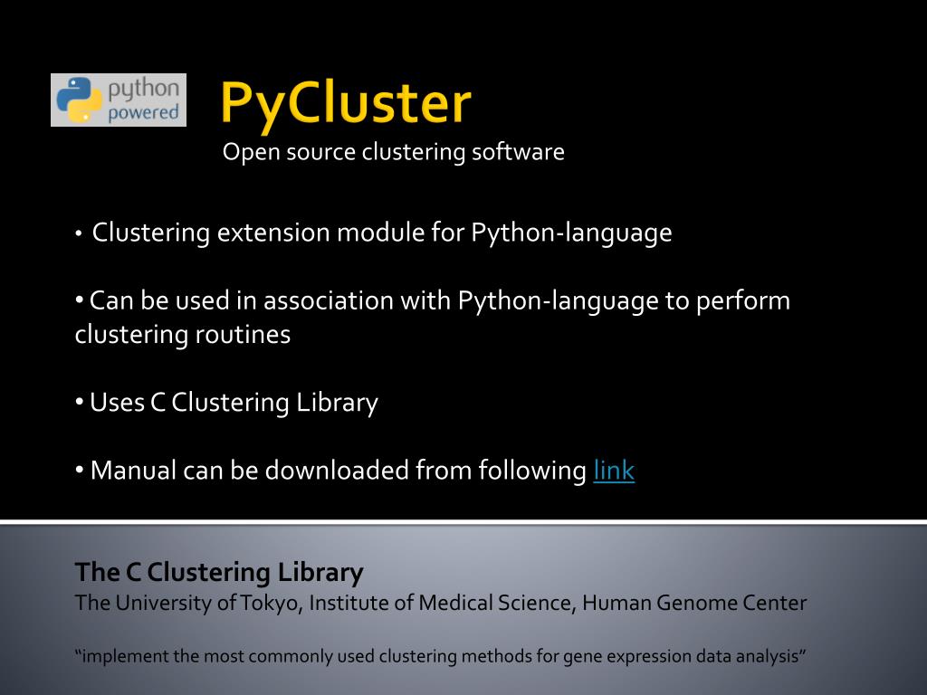 Open source clustering software • Clustering extensionmodule for Python-language • Canbeused in association withPython-language to perform clustering routines • Uses C Clustering Library • Manualcanbedownloadedfromfollowinglink • The C Clustering Library • The University of Tokyo, Institute of Medical Science, Human Genome Center • “implement the most commonly used clustering methods for gene expression data analysis” PyCluster