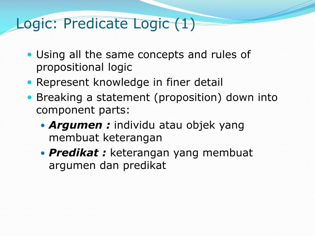 Logic: Predicate Logic (1) • Using all the same concepts and rules of propositional logic • Represent knowledge in finer detail • Breaking a statement (proposition) down into component parts: • Argumen : individuatauobjek yang membuatketerangan • Predikat :keterangan yang membuatargumendanpredikat
